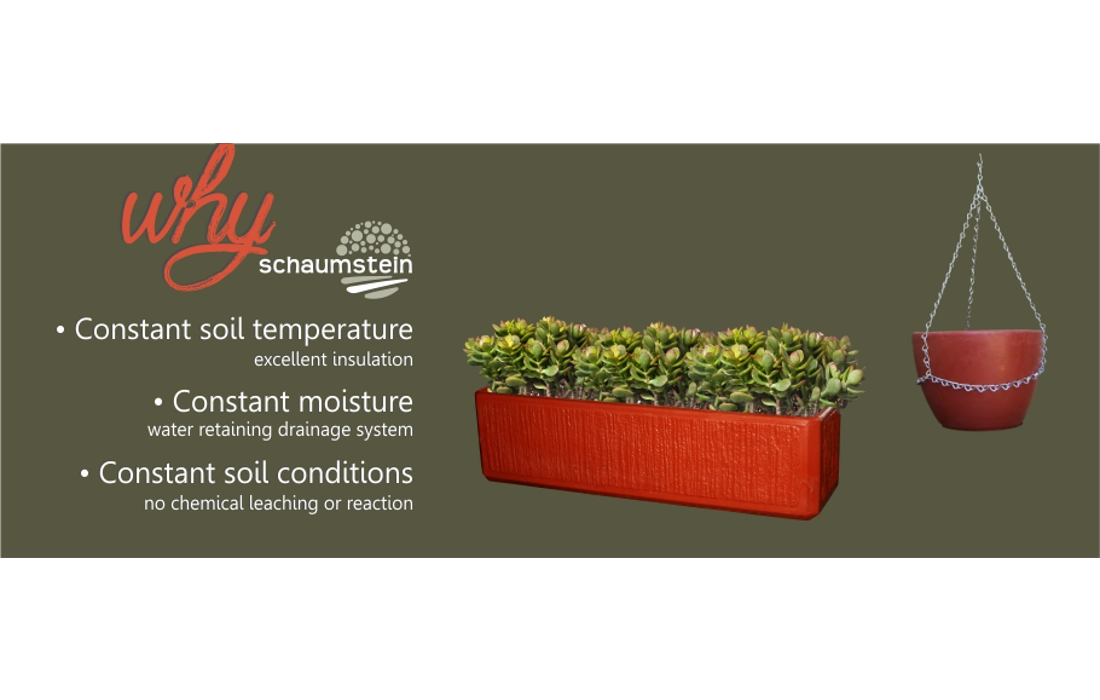 SCHAUMSTEIN se tuinartikels is uniek in Suid-Afrika. Die produkte word vervaardig van rigiede geslote sel Poli-uretaan skuim. Die produkte is baie lig en vergemaklik die hantering en logistiek daarvan. (Die digtheid ongeveer 5% van dié van beton.)